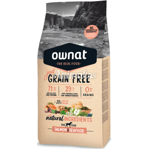 Fish 37% (fresh salmon* min. 10%, fresh seafood* min. 10% before extrusion, hydrolysed salmon 10% and dehydrated salmon 7%), dehydrated chicken (28%), whole peas*, poultry fat (preserved with natural antioxidants), cassava roots*, carob pods*, dehydrated potato*, hydrolysed chicken protein, brewer’s yeast*, beet pulp, fresh apple* (1%), linseed*, dehydrated marine algae*, rock salt*, fish oil (preserved with natural antioxidants), fructo- and mannan-oligosaccharides, dehydrated alfalfa*, glucosamine, chondroitin, yucca schidigera, cranberries*, thyme*, camomile flower*, fennel*, echinaceas*, green tea*. *Natural ingredients